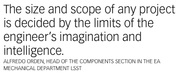 Alfredo Orden, head of the components section in the EA mechanical department, leads a team of 20 engineers specialized in mechanical engineering, control systems, electrical engineering, construction and layout. “There are a number of challenges that we have faced with the design of the LSST – supporting an 8.4-metre-diameter mirror assembly and a three-metre digital sensor, designing a structure that will withstand the frequent seismic shocks in this part of Chile and making sure that the whole assembly moves with pinpoint accuracy and has minimal downtime and maintenance requirements,” he says. “All these factors require the highest standard of engineering design.”