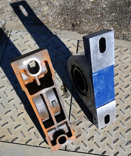 The high-performance spherical roller bearings of the Timken bearing units (top photo) are installed in a solid cast housing that withstands the extreme stresses when the Digger is used. The previously installed, hollow bearing units from another manufacturer (lower photo, left bearing) broke prematurely and had to be replaced frequently